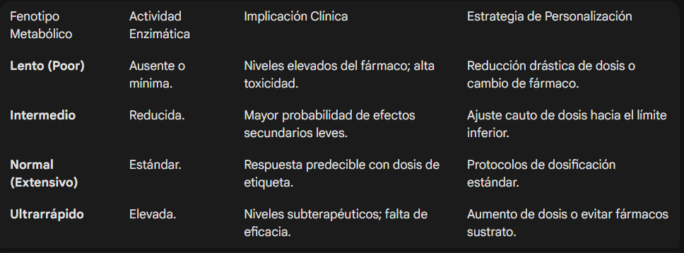 La mayoría de los psicotrópicos son procesados por las enzimas del sistema citocromo P450 (CYP450), siendo CYP2D6 y CYP2C19 las más relevantes. Las variaciones genéticas en estos genes pueden clasificar a los pacientes en fenotipos que determinan la seguridad y eficacia del tratamiento. Por ejemplo, un paciente categorizado como metabolizador lento para CYP2D6 corre un riesgo elevado de toxicidad con dosis estándar de antidepresivos tricíclicos o ciertos antipsicóticos, mientras que un metabolizador ultrarrápido podría nunca alcanzar niveles plasmáticos terapéuticos, resultando en un fracaso del tratamiento mal interpretado como resistencia.