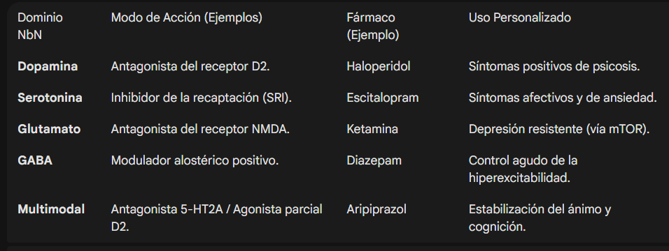 Esta transición hacia la NbN facilita la «psicofarmacología informada por circuitos», donde el clínico evalúa qué dimensiones psicopatológicas están afectadas (ej. afecto negativo, anhedonia, disfunción ejecutiva) y selecciona el agente con el perfil neuroquímico más adecuado, independientemente de la etiqueta diagnóstica clásica.