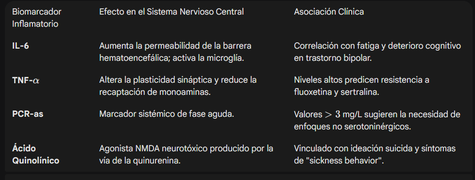 La proteína C reactiva de alta sensibilidad (PCR-as), la interleucina-6 (IL-6) y el factor de necrosis tumoral alfa (TNF-$\alpha$) han emergido como indicadores críticos de la respuesta terapéutica. Niveles de PCR-as superiores a $3$ mg/L se asocian consistentemente con una respuesta deficiente a los ISRS. Estos pacientes, en cambio, pueden mostrar una mejor respuesta a antidepresivos con mecanismos noradrenérgicos o dopaminérgicos, o incluso a la adición de agentes antiinflamatorios como el infliximab en subgrupos específicos.