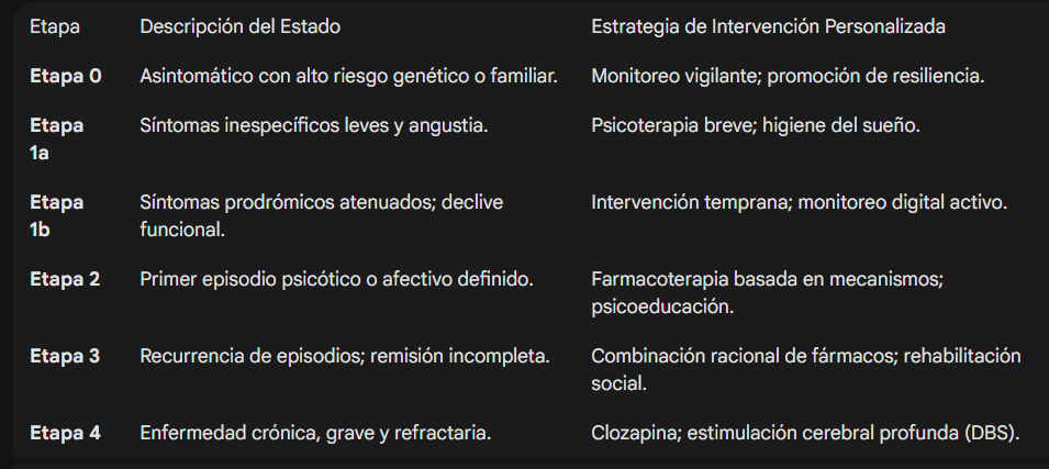 Este modelo propone seis etapas (0 a 4), destacando la importancia de actuar en las fases prodrómicas (1a y 1b), donde los síntomas son inespecíficos pero el riesgo de progresión es alto. La etapificación permite aplicar el principio de proporcionalidad: intervenciones benignas y de bajo riesgo (psicoterapia, cambios de estilo de vida, omega-3) en etapas tempranas, y farmacoterapia intensiva o neuromodulación en etapas avanzadas de enfermedad crónica o refractaria.